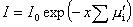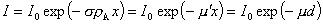 Ha elsõ közelítésben eltekintünk a hatáskeresztmetszet energiafüggésétõl, feltételezve, hogy a részecskék egymástól függetlenül lépnek kölcsönhatásba a közeggel, és a kölcsönhatások nem befolyásolják számottevõen a közeg sajátságait, I0 - I és 0 - x határok között integrálva, feltéve, hogy s állandó:
