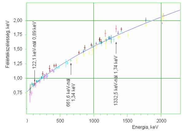 Egy HPGe detektor félértékszélességének energiafüggése 59 keV és 2.0 MeV energiatartományban 0.250 keV/csatorna erõsítés esetén