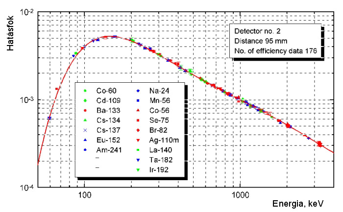 ahol R a teljesenergia-csúcsban mért számlálási sebesség, Pg pedig az Eg energiájú g -sugárzás abszolút intenzitása. A hatásfok energiafüggõ, a függvény analitikus formája log–log skálájú polinom illesztésével kiszámítható. Félvezetõ detektorok abszolút teljesenergia-csúcs hatásfokának energiafüggése jellegzetes alakú.
