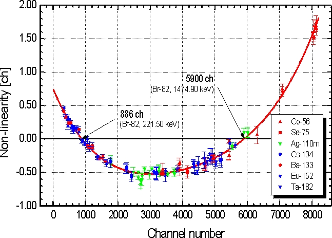 Egy g -spektrométer nonlinearitási görbéje 0.250 keV/ch erõsítés esetén 221.5 keV és 1474. keV (82Br) energiájú teljesenergia-csúcsokra történõ belsõ kalibrálással.