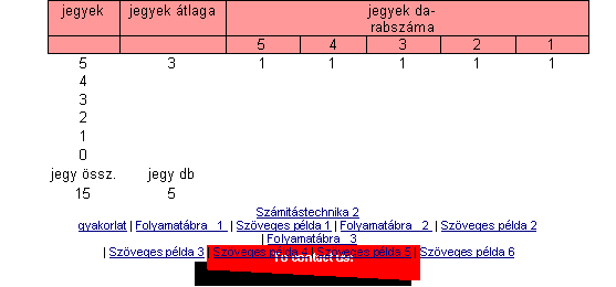 Sub osztalyzas() Dim j%, jo%, j5%, j4%, j3%, j2%, j1% Dim atl!, kiir% 'fejléc kiírása Cells(1, 1) = "jegyek": Cells(1, 2) = "jegyek átlaga" Cells(1, 5) = "jegyek darabszáma" Cells(2, 3) = "5": Cells(2, 4) = "4": Cells(2, 5) = "3" Cells(2, 6) = "2": Cells(2, 7) = "1" kiir = 0 j5 = 0: j4 = 0: j3 = 0: j2 = 0: j1 = 0: jo = 0 Do j = InputBox("Add a jegyeket, ha 0-t adsz, akkor vége a beolvasásnak") Cells(kiir + 3, 1) = j: jo = jo + j kiir = kiir + 1 If j = 5 Then j5 = j5 + 1 ElseIf j = 4 Then j4 = j4 + 1 ElseIf j = 3 Then j3 = j3 + 1 ElseIf j = 2 Then j2 = j2 + 1 ElseIf j = 1 Then j1 = j1 + 1 End If Loop Until j = 0 Cells(kiir + 3) = "jegy össz.": Cells(kiir + 3) = "jegy db" Cells(kiir + 4, 1) = jo: Cells(kiir + 4, 2) = kiir - 1 Cells(3, 2) = jo / (kiir - 1) Cells(3, 3) = j5: Cells(3, 4) = j4: Cells(3, 5) = j3 Cells(3, 6) = j2: Cells(3, 7) = j1 End Sub
